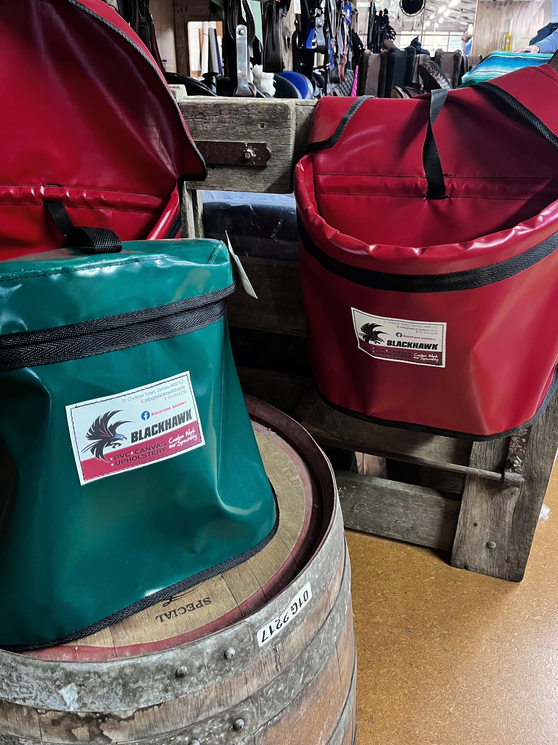 Designed for durability, our heavy duty ripstop PVC bucket bags are able to attach to your float or fence. Perfect for a water bucket or feed.